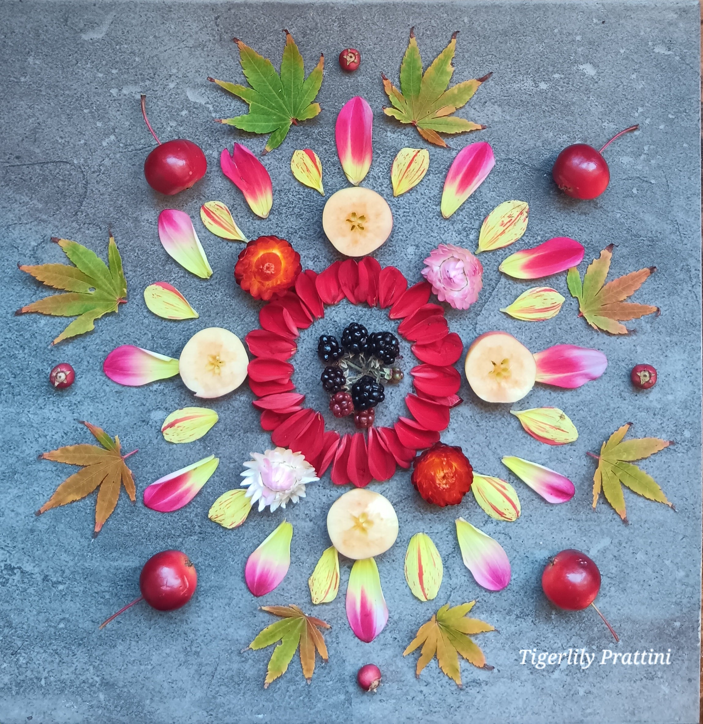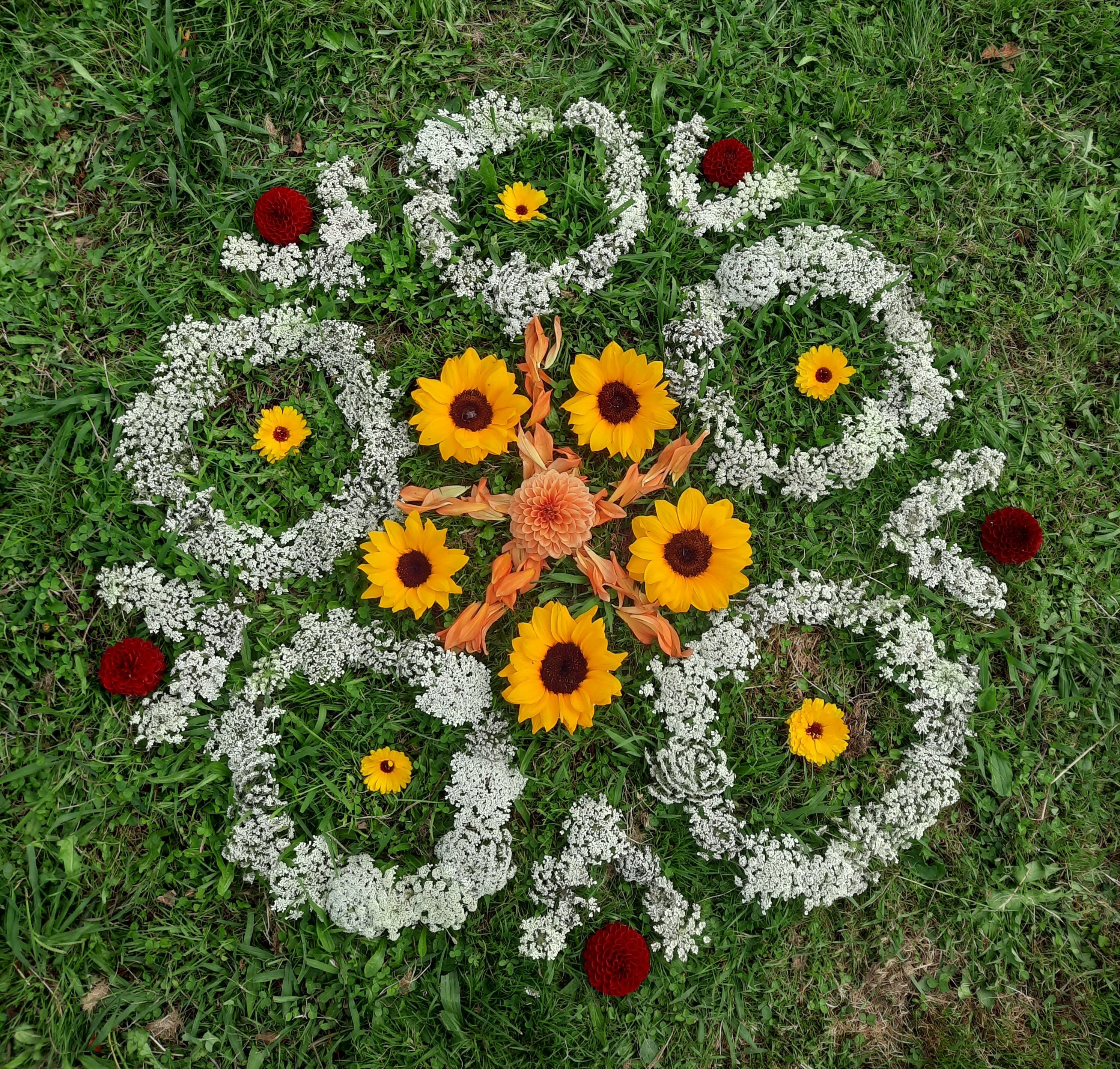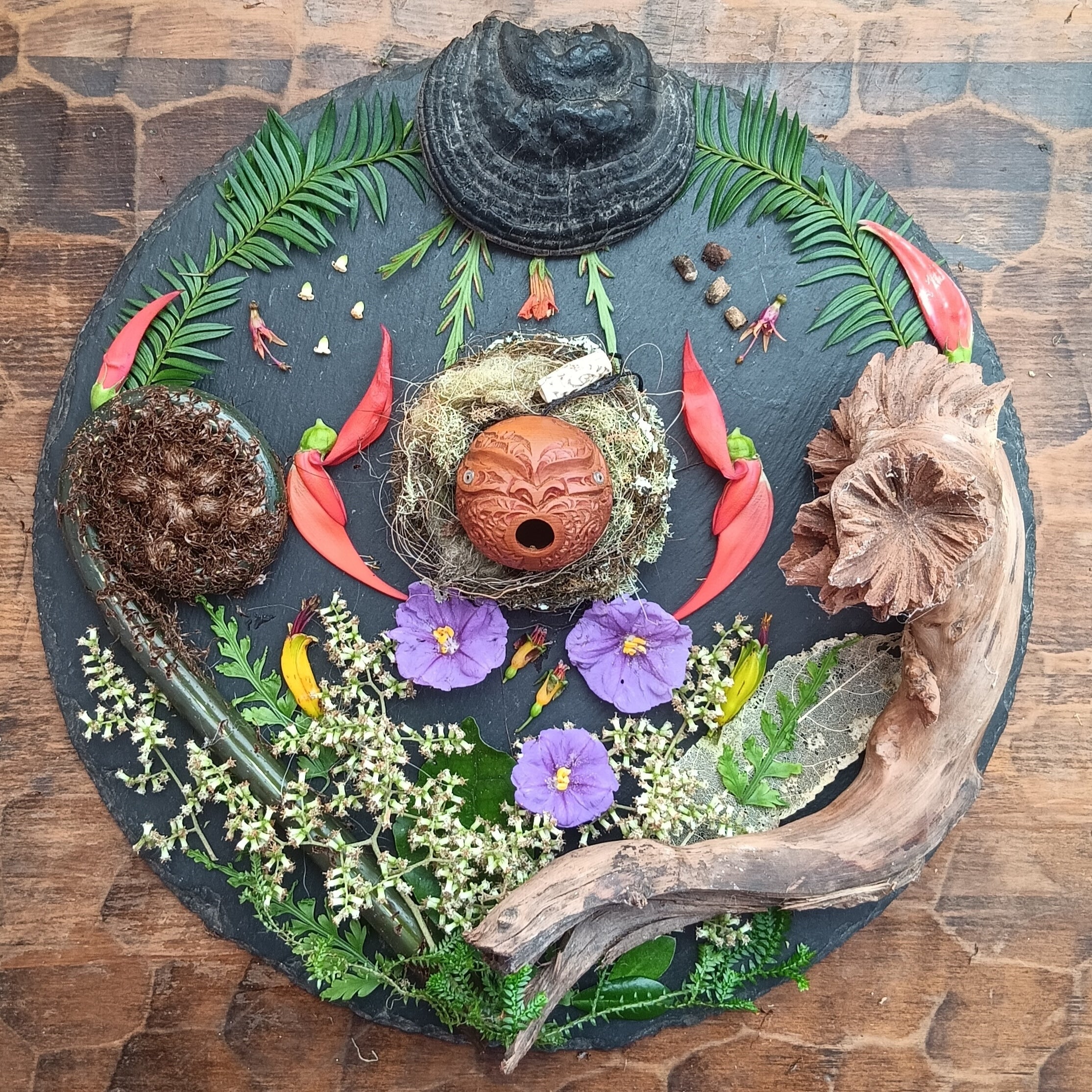 Some of the eco-mandala's are flower fiestas of high summer, others speak to the winds of seasonal flux of spring, or the watery release of Autumn. Some mix fossil and stone, nest and egg, shell and bone.